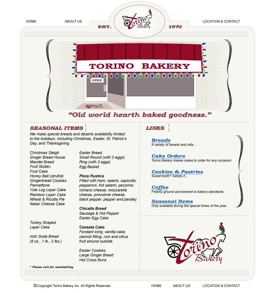 HOME ABOUT CONTACT Torino Bakery Inc. Breads Cake Orders Cookies&Pastries Coffee Seasonal HOME ABOUT CONTACT